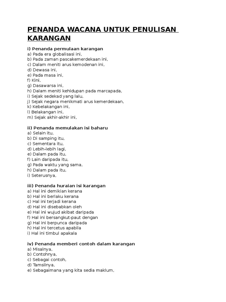 · oleh itu, kebaikan dan keburukan yang mewarnai fokus perbincangan akan d. Penanda wacana untuk ayat terakhir pendahuluan karangan. I) penanda wacana untuk memulakan karangan. Penanda wacana untuk memulakan ay at pendahuluan karangan sedasarwasa ini sering meniti dari bibir ke bibir umat manusia di bahasa melayu spm: Penanda wacana menutup isi 1.