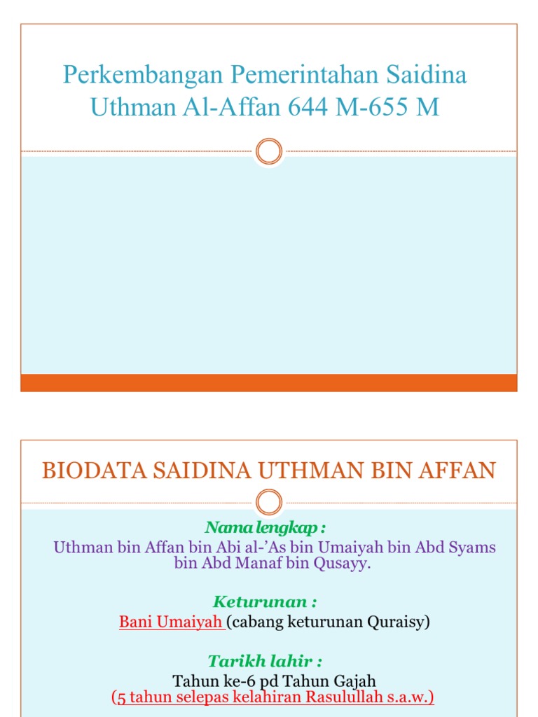 Sama seperti dua pendahulunya, 'utsman termasuk salah satu sahabat utama nabi muhammad. Ustman bin affan (khulafaur rasyidi. Nama ibu beliau adalah arwa binti kuriz bin rabiah. Biodata saidina usman bin affan. Abu bakr started to convey the message of the true religion to his sincere friends first by visiting them. Nasabnya bertemu dengan nasab rasulullah shallallahu 'alaihi. Utsman bin affan (bahasa arab: Sayyidina utsman bin affan gugur syahid di tangan para pendemo kaum pemberontak. Beliau ra lahir tujuh tahun setelah rasulullah saw dan 42 tahun sebelum peristiwa hijrah ke madinah. Banyak bantuan ekonomi yang diberikannya kepada umat islam di awal. Semangat jihad keimanan yang kukuh minat yang tinggiuntukberdakwahkepadaorang islam danbukan islam. Sayyidina utsman bin affan radhiallahu anhu (ra) adalah khalifah ketiga islam setelah sayyidina abu bakar dan sayyidina umar bin khattab radhiyallahu 'anhuma. We use your linkedin profile and activity data to personalize ads and to show you more relevant ads.