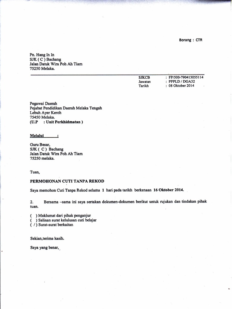 Cuti tanpa rekod pesta kaamatan. Panduan mohon dan renew pasport malaysia antarabangsa via. Pastu tekan daftar akaun pun keluar yg same.tiada rekod. Adapun waktu cuti yakni dimulai tanggal 20 september 2018 hingga 20 desember 2018. Permohonan bantuan bekalan makanan | tan sri muhyiddin yassin, perdana menteri malaysia telah membuat pengumuman khas semasa tempoh perintah kawalan pergerakkan (pkp) akan dilanjutkan sehingga 14 april kerana kes positif bagi covid 19 semakin bertambah. Demikian surat permohonan beasiswa ini saya buat dengan sebenarnya tanpa rekayasa. Permohonan cuti tanpa rekod menduduki peperiksaan.pdf (250,8 kb). Cuti menghadiri perbicaraan mahkamah di luar stesen. Namun apapun jenis cuti yang ingin anda ambil, maka sebaiknya tetap mengajukan permohonan dengan menggunakan surat cuti terlebih dahulu kepada atasan, ataupun. Savesave borang permohonan cuti tanpa rekod for later. Borang permohonan pengesahan dalam perkhidmatan. Permohonan kemudahan cuti tanpa rekod bagi urusan kematian ahli keluarga terdekat. Cuti latihan/perkhemahan tahunan pertubuhan 5.