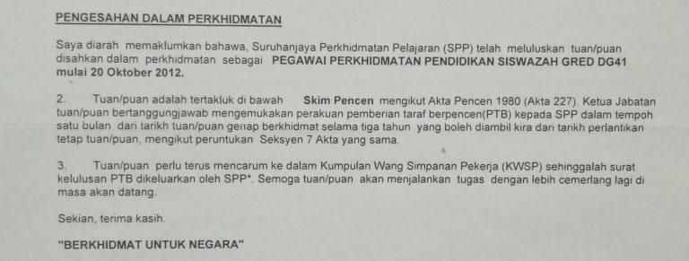 Panduan buat penjawat awam yang bakal menduduki peperiksaan perkhidmatan awam tahun 2020. Opsyen bagi skim kwsp (jadual kelima). Ketua jabatan hendaklah memperaku pengesahan dalam perkhidmatan pegawai dalam tempoh satu (1) bulan dari tarikh pegawai itu didapati layak bagi pengesahan dengan mengemukakan dokumen seperti berikut: Diperakukan untuk disahkan dalam perkhidmatan kerana telah menjalankan tugasnya dengan jujur, tekun dan berkebolehan dan saya berpuas hati dengan sifat peribadi dan kelakuannya.* tidak diperakukan untuk disahkan dalam perkhidmatan. Cadangan jadual untuk imunisasi yang tidak terkandung program imunisasi kebangsaan: